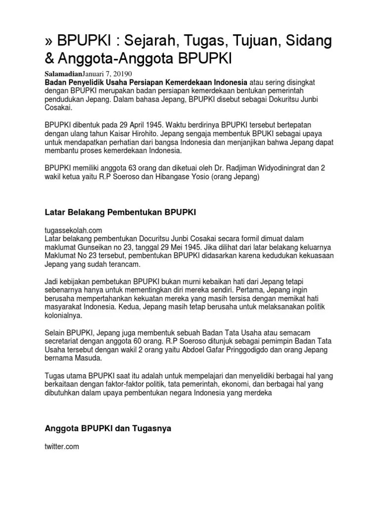 Bpupki atau dalam bahasa jepang disebut dokuritsu junbi cosakai. Tugas panitia sembilan di sidang bpupki dan daftar anggotanya. Bpupki dibentuk oleh jepang pada 29 april . 1) disebut juga dokuritsu junbi inkai. Tugas bpupki atau yang disebut juga dengan dokuritsu junbi cosakai meliputi beberapa hal, kids.